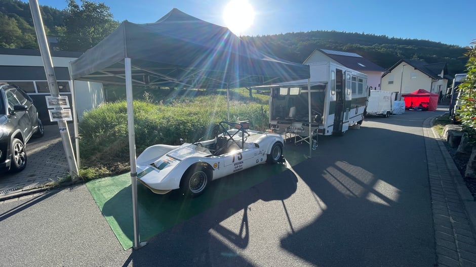 Wir wurden eingeladen, den Behnke Condor zusammen mit anderen CANAM und INTERSERIE Fahrzeugen in einem Demolauf am Samstag und Sonntag um die Mittagszeit herum zu präsentieren. Was für ein phantastisches Wochenende im Nassen. Der Condor ging im Regen extrem gut und Stephan konnte zwei Porsche 917 (Kurzheck und /30) auf einmal auf der Start-Ziel-Geraden überholen. Es war toll, so viele Freunde wiedergesehen zu haben. Hier ein kleiner Link zu einem netten Video von der Aufwärmrunde.